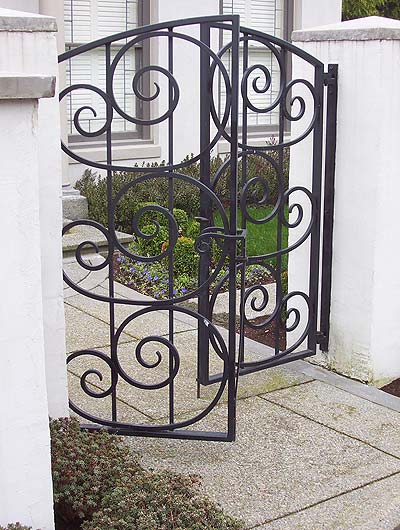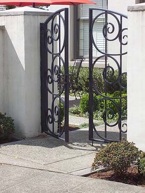 This walled garden for a Spanish-style stucco house set only 20 feet back from the curving front sidewalk was designed to make the tiny front garden seem both larger and more intimate, functioning as an outdoor playroom for small children and a seating area for adults. Since the back garden slopes and is set more than one level down from the main floor of the house, visibility for keeping an eye on children playing in back was poor. The front garden is much more easily accessible from the house. Since the before condition was limited to a scruffy lawn between the front steps and the street, Brooks Kolbs solution employed new free-standing stucco-faced walls along the street and matching perpendicular screens of tall, narrow Italian Cypress trees framing the house at both ends. In a few years, the walls will be covered with climbing roses. A small wall-mounted fountain provides a focal point and the sound of water. Tying the whole composition together in line with the front door is an elegant ornamental iron gate in a vibrant swirling pattern that contrasts vividly with the solid simplicity of the stucco walls. Landscape Contractor: Artemis Landscapes.