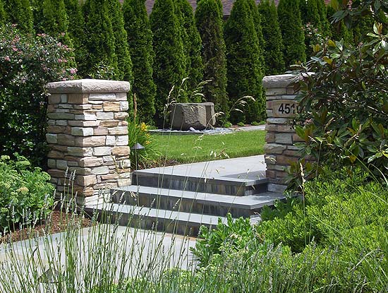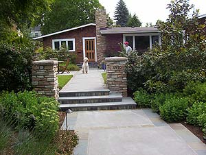 Designed to enhance a recently remodeled 1950s modern one-story house, this relatively large front garden has a dual function as both the main entry to the house and an outdoor living room. The owner preferred to concentrate family living in the front garden because of its close proximity to a new dining room and because the back garden is sloping, located down one level and compromised by relatively high visibility from neighboring houses and a church. Three steps flanked by tall piers clad in cultured stone were introduced to subtly separate the private family living space from the semi-public approach from the street. Separated from the main garden, an informal off-street parking space was provided on the south side of the lot. A diagonal walk gives access from the parking to the main terrace, which is paved in concrete with bluestone bands. Dining al fresco, the family and friends are treated to the sound and sight of a small basalt-stone fountain surrounded by a basin of pebbles. Landscape Contractor: Tallar Landscaping.