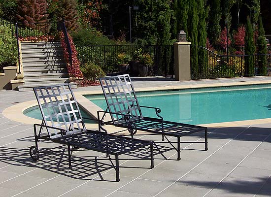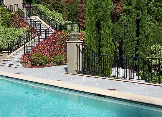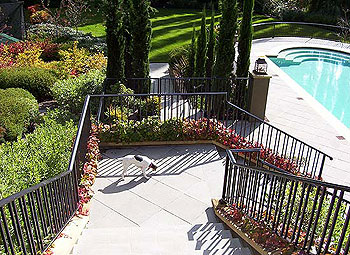 stairs flanking the pool terrace lead down past accent plantings of Italian