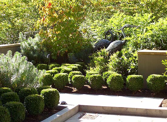 fountain, the main entry to the house is framed by pots and low Boxwood