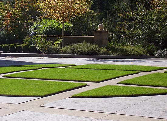 turf circle pierced by a grid of concrete bands, a long stucco wall with a