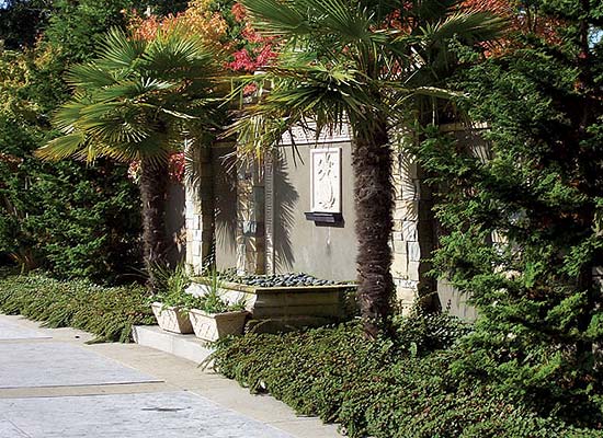 wall fountain flanked by two large Windmill Palm Trees, and a bronze sculpture