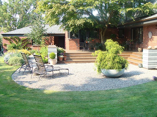deck for outdoor entertaining. Thus it was no surprise that Seattle Landscape Architect Brooks Kolb proposed that the centerpiece of the garden design should be a large, ipe deck in the corner of the two wings of the house and at the main floor level, with four gentle steps down to a garden sunning terrace paved with pea gravel. Carefully arranged with a cut-out to preserve a beautiful, large Japanese Maple and edged with ample shingle-covered seat walls, the deck was sized expressly to permit outdoor dining at ease. Then, to soften the angular lines which are always a feature of L-shaped buildings, Brooks designed a flowing lawn to wrap around the curve of the gravel terrace. This contrast of rectilinear and curving lines was one of the key design contributions of the celebrated mid-century California landscape architect, Tommy Church, known locally for his design for Lakewold, a publicly accessible garden in Lakewood. Since the clients are avid gardeners, the garden contains a few unusual plants along with many dependable stand-bys and features a large gravel-covered area for potting next to a garage which is now used as a garden shed. The center of the garden will become increasingly dominated over the years by a beautiful large Red Oak tree. |