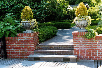 Home > Projects > Denny Blaine GardenA Denny Blaine Garden Inspired by the formal gardens of Colonial Williamsburg, Virginia, this "L"-shaped garden on a hilly site in the Denny Blaine neighborhood takes advantage of a wide side yard. Accessed from a narrow lane through a tall whitewashed brick wall, the renovated Georgian-style house was built perpendicular to the street so that its main front entry faade faces onto the side yard rather than the lane. This arrangement allowed Bill Talley and Seattle landscape architect Brooks Kolb to emphasize stunning views out across Lake Washington to the Cascades.Beginning with a formal rectangular lawn edged in English Boxwood, the main garden steps down to extend outwards towards the view by the addition of an Ipe (tropical Ironwood) deck cantilevered over the slope. A narrow side-stair leads downwards towards a surprise element a glass-roofed summer house covered with Wisteria and containing an outdoor kitchen with a fireplace for outdoor dining. The landscape architects finished the composition by locating a small stone fountain imported from a French chateau directly on an axial view-line with the massive steps leading up to the front porch. The shorter arm of the "L" near the garden entry adjoins the kitchen and features a paved terrace for three children to tricycle on. This space is separated from the main garden by a large white pergola designed by architect Brandt Hollinger, with whom Brooks Kolb has repeatedly collaborated. The landscape contractor, also a frequent collaborator, was Gardens by Michael Angelo. Credits: Landscape Contractor: Gardens by Michael Angelo Residential Remodel Architect: Brandt Hollinger House General Contractor: Schuchart Dow |
