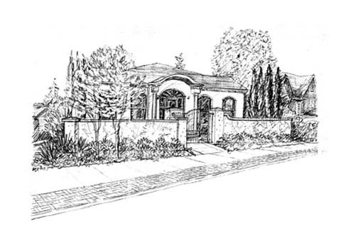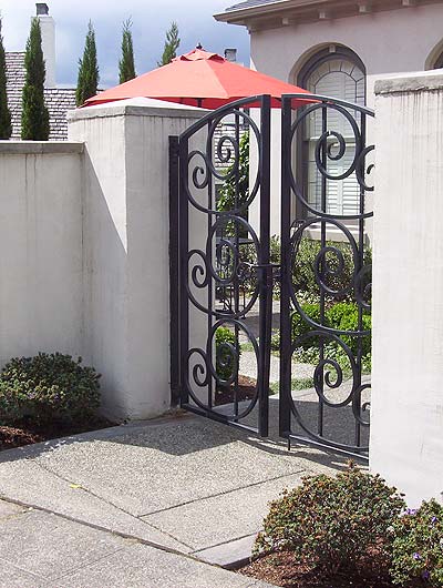 This walled garden for a Spanish-style stucco house set only 20 feet back from the curving front sidewalk was designed to make the tiny front garden seem both larger and more intimate, functioning as an outdoor playroom for small children and a seating area for adults. Since the back garden slopes and is set more than one level down from the main floor of the house, visibility for keeping an eye on children playing in back was poor. The front garden is much more easily accessible from the house. Since the before condition was limited to a scruffy lawn between the front steps and the street, Brooks Kolbs solution employed new free-standing stucco-faced walls along the street and matching perpendicular screens of tall, narrow Italian Cypress trees framing the house at both ends. In a few years, the walls will be covered with climbing roses. A small wall-mounted fountain provides a focal point and the sound of water. Tying the whole composition together in line with the front door is an elegant ornamental iron gate in a vibrant swirling pattern that contrasts vividly with the solid simplicity of the stucco walls. Landscape Contractor: Artemis Landscapes.