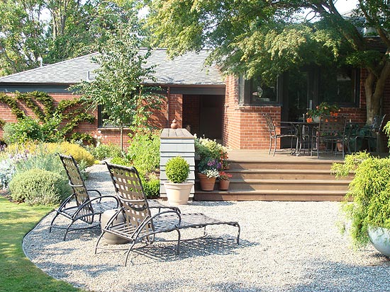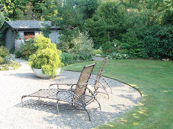deck for outdoor entertaining. Thus it was no surprise that Seattle Landscape Architect Brooks Kolb proposed that the centerpiece of the garden design should be a large, ipe deck in the corner of the two wings of the house and at the main floor level, with four gentle steps down to a garden sunning terrace paved with pea gravel. Carefully arranged with a cut-out to preserve a beautiful, large Japanese Maple and edged with ample shingle-covered seat walls, the deck was sized expressly to permit outdoor dining at ease. Then, to soften the angular lines which are always a feature of L-shaped buildings, Brooks designed a flowing lawn to wrap around the curve of the gravel terrace. This contrast of rectilinear and curving lines was one of the key design contributions of the celebrated mid-century California landscape architect, Tommy Church, known locally for his design for Lakewold, a publicly accessible garden in Lakewood. Since the clients are avid gardeners, the garden contains a few unusual plants along with many dependable stand-bys and features a large gravel-covered area for potting next to a garage which is now used as a garden shed. The center of the garden will become increasingly dominated over the years by a beautiful large Red Oak tree. |
